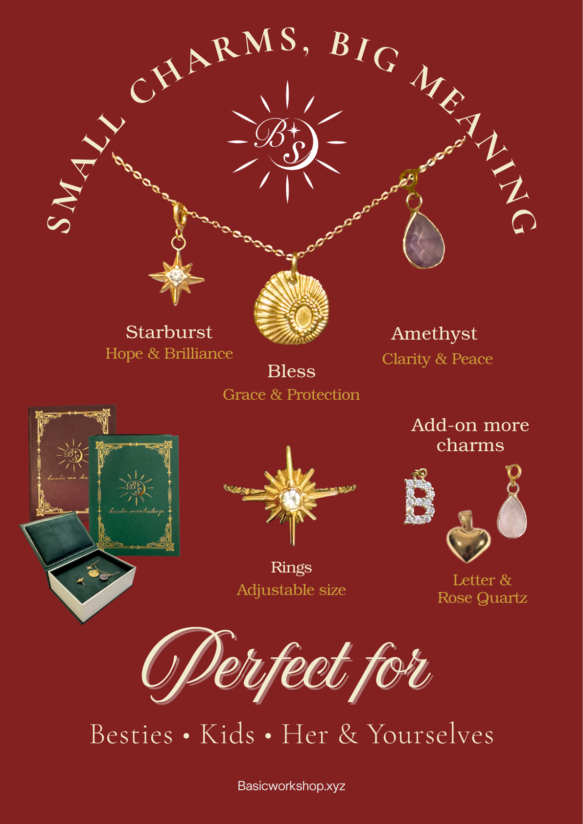 每個 charm 都有一個寓意——守護、幸運、光芒、愛。