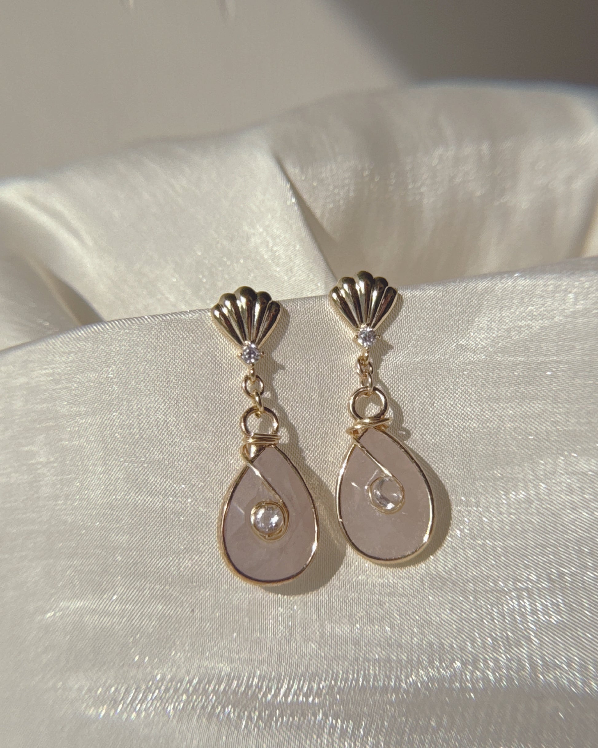 A elegant drop-earring series designed to move lightly with you — each piece highlights the natural beauty of crystals through delicate details and thoughtful trims.