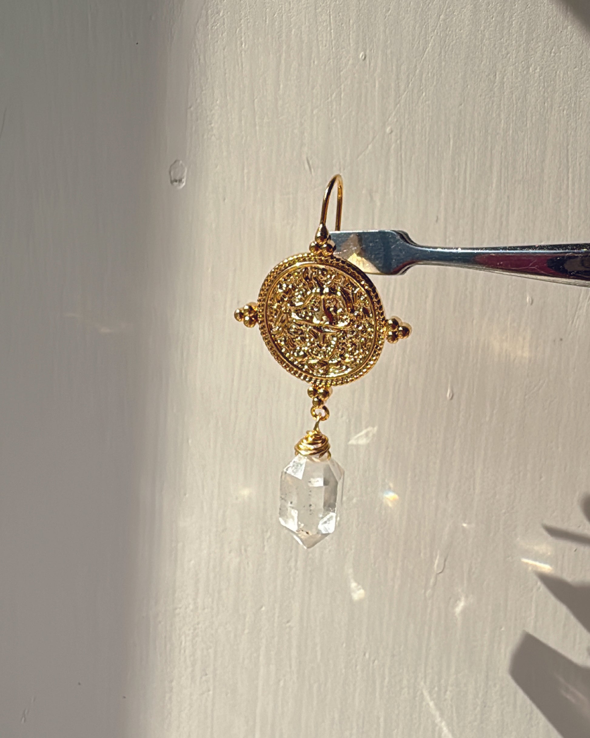 An ethnic-inspired design with a subtle vintage touch. The raw clarity of Herkimer quartz brings an effortless, timeless character to the piece.