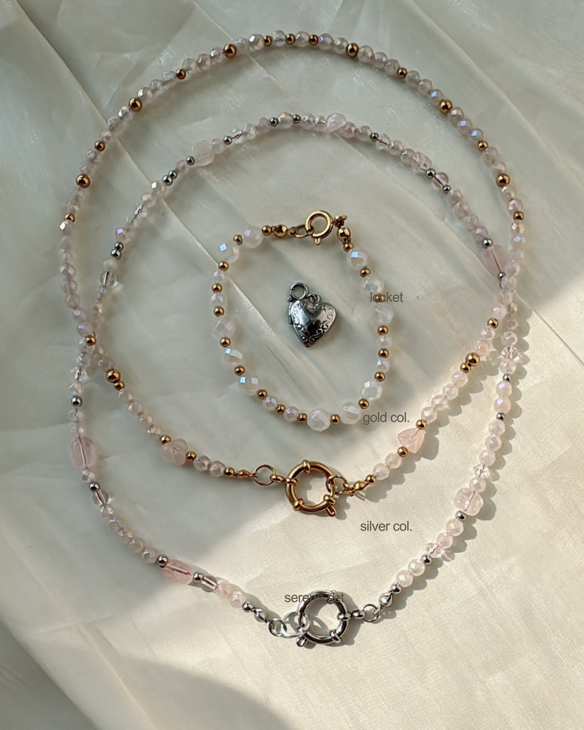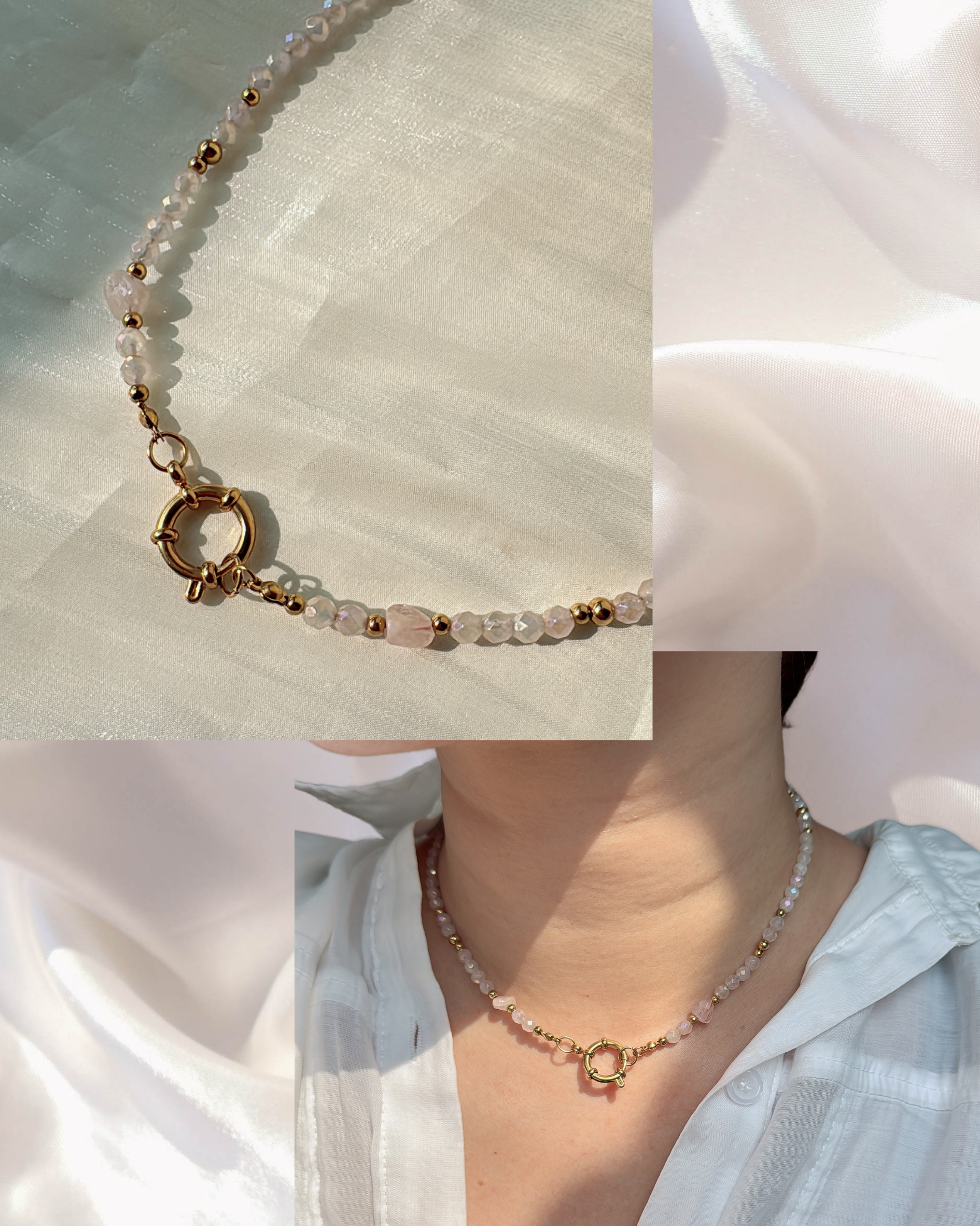 This piece features a sparkle-cut rose quartz with an aura coating,