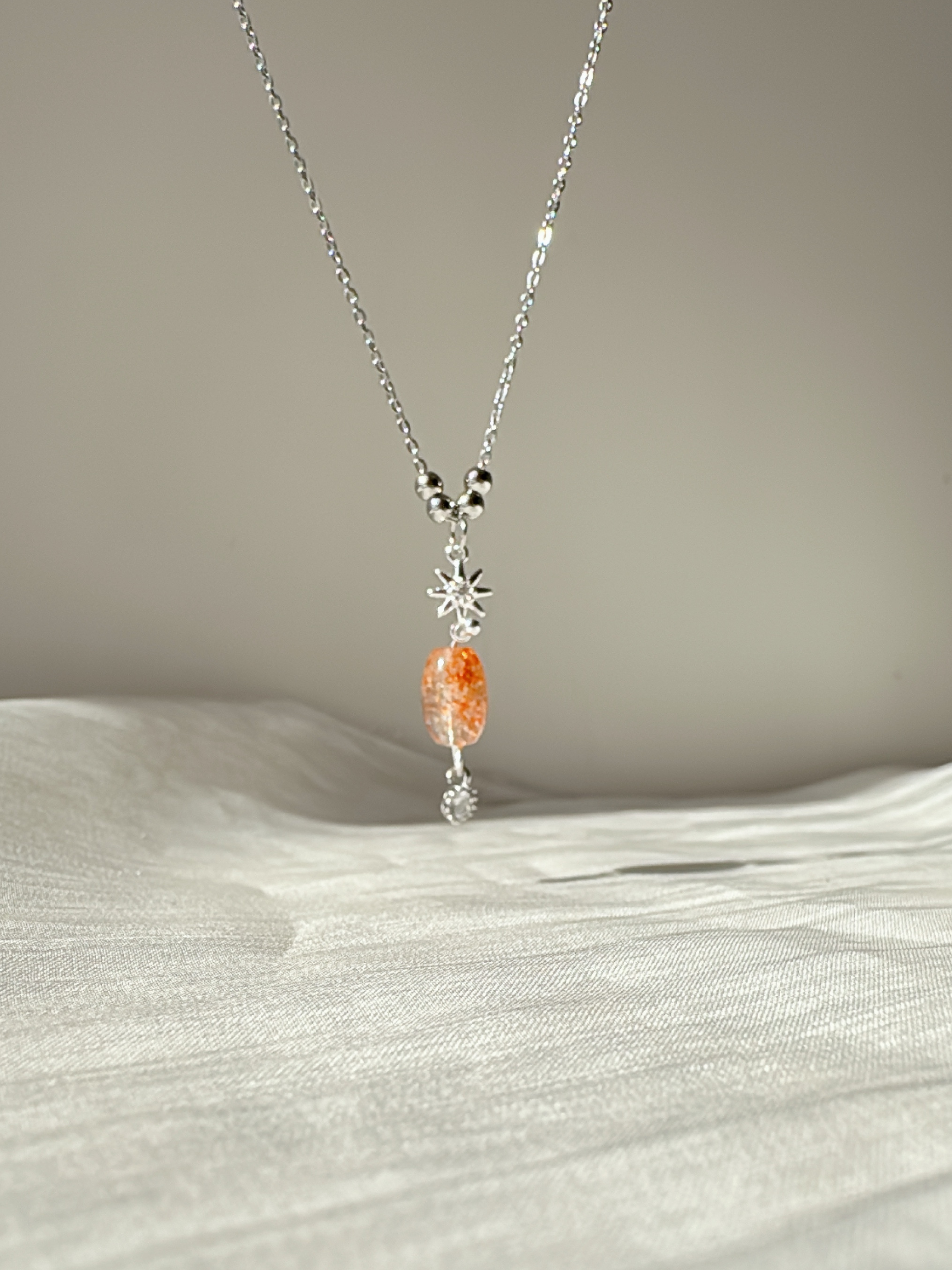A shinning star carring a sunstone, with a mini sparkle CZ stone at bottle. Bling but not bold.
